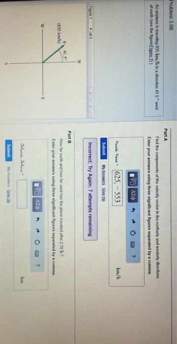 An airplane is traveling 835 kmh in a direction 415 west of north Fig. B How far N in 415 north and how far W E west has the plane traveled after 175 h. An aeroplane is traveling 835 kmh in a direction 391 west of north.